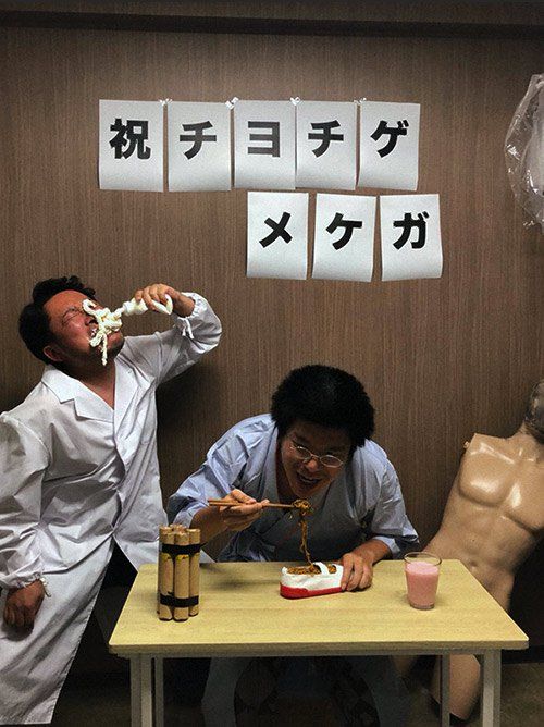 ・ビニールシートの上で誰かの土台になってて、その横に木彫りの熊がある状況って何?