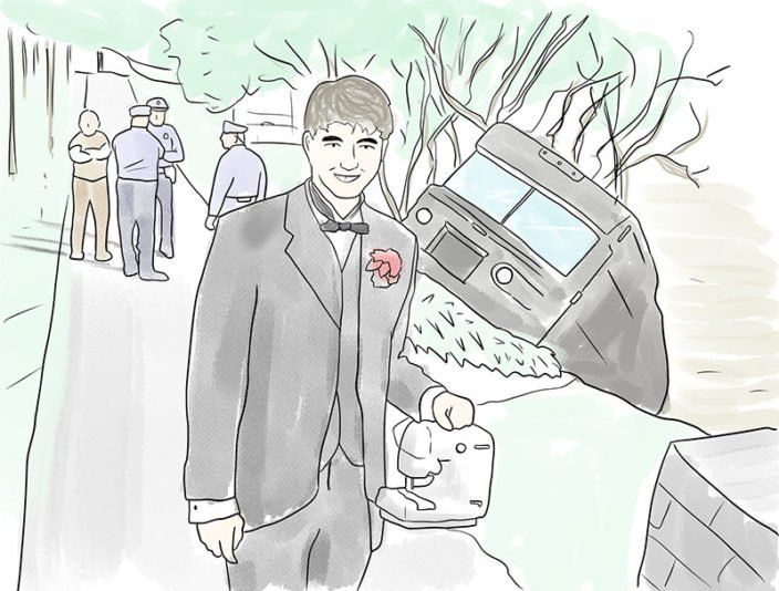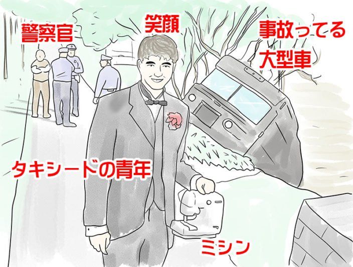 路肩で事故ってる大型車と、その近くで事情聴取のようなことをしている警察官の前でタキシードの青年がミシンを持って笑顔でポーズを取っているという写真です。