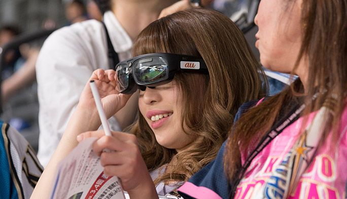 そう、スタンドでニッコニコのみなさんが装着されているのが、ARスマートグラス。レンズ自体は素通しで、フィールドでの試合の模様をつぶさに見ながら、そこにさまざまなデータが映し出されるという仕組み。たとえば打率やどのコースをよく打てるか、打者と投手の対戦成績、選手の「調子度」など。