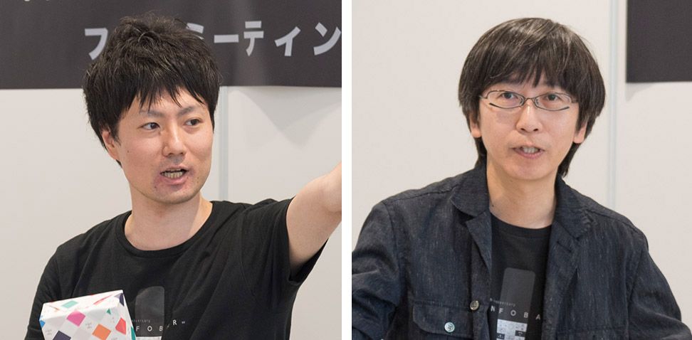 ファンミーティングは、KDDI 商品・CS統括本部 プロダクト企画部の砂原哲と美田惇平によるプレゼンテーションからスタート。砂原はaDpに最初期から関わり、すべてのINFOBARに携わってきました。美田は最新作のINFOBAR xvのプロダクトネージャー、いわばKDDI側の開発責任者です。