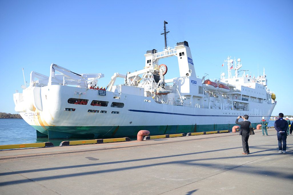 苫小牧港に入港するKDDIオーシャンリンクとKDDIから乗船したスタッフ