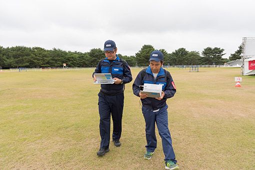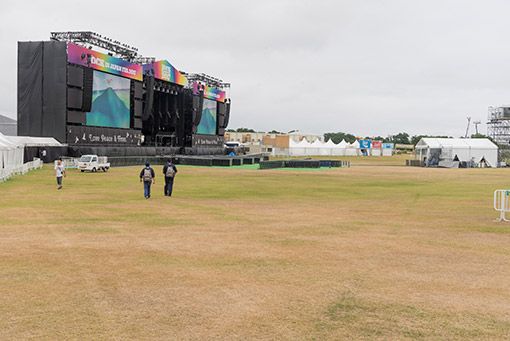 アンテナからきちんと電波が吹けているか、会場をまさに塗りつぶすように確認していく。約6万人収容のグラスステージをおおよそ1時間かけて歩いた。ずっと後を追い、時には手前に回って撮影するカメラマンもメモを取るライターもヘトヘト。